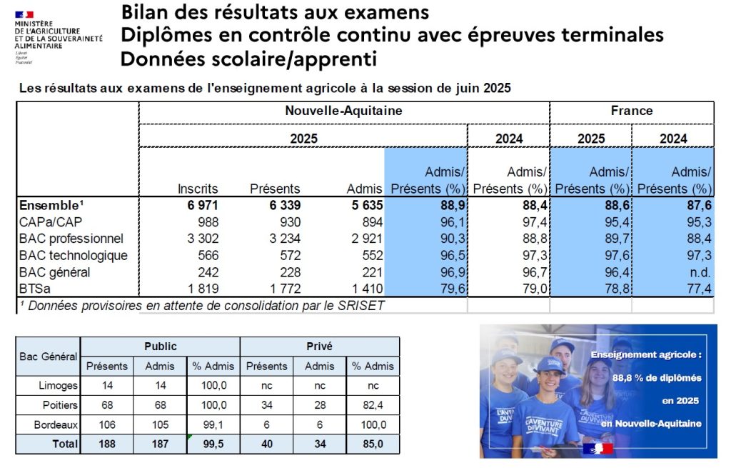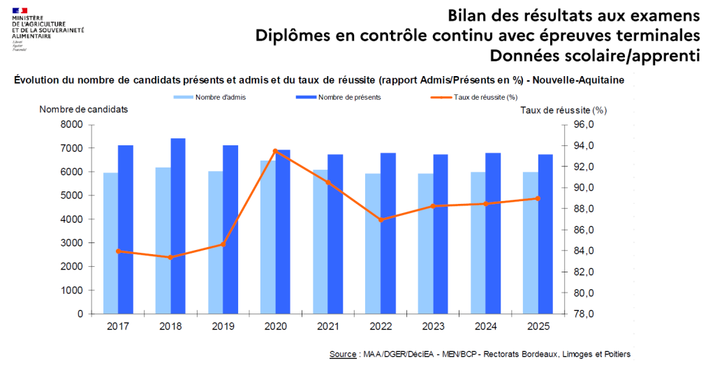 Ce que l’on note : une moyenne qui reste à l’identique de l’année dernière et au niveau de la moyenne nationale. Une légère augmentation des résultats s’observe sur 3 ans. L’administration renvoie vers le site de la DRAAF pour consulter les résultats au fur et à mesure de leur publication.