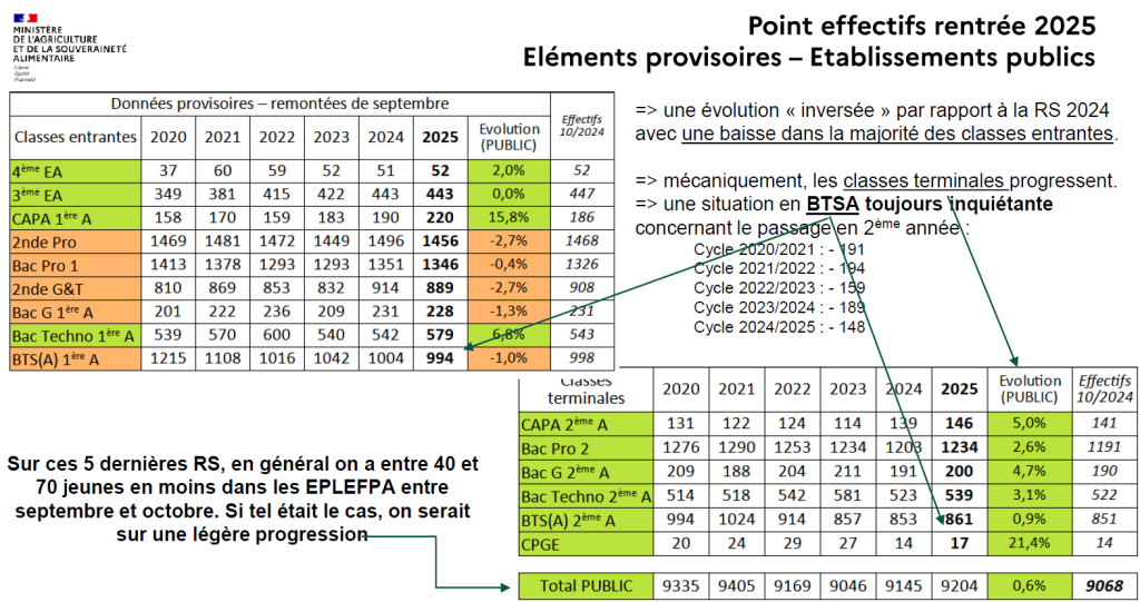– BTSA : effectif légèrement en baisse avec déperdition en cours de formation. Difficulté à recruter et perte durant le cycle. Pourtant l’Administration s’affirme confiante et s’attend, une fois les effectifs stabilisés, à une légère progression.