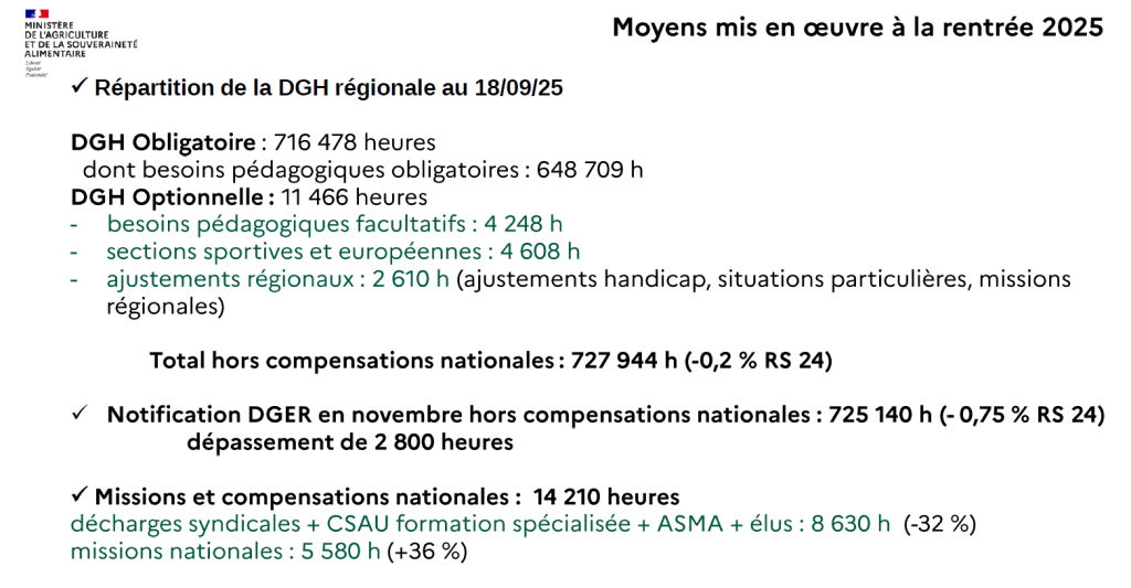 L’Administration alerte que la DGER est susceptible de demander un effort de mutualisation (à l’échelle nationale) plus important cette année. Ainsi certaines régions redonnent de la DGH qui est redistribuée pour répondre aux besoins de classe où l’on a des effectifs.